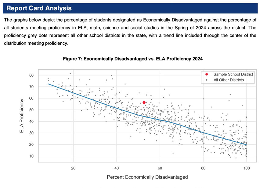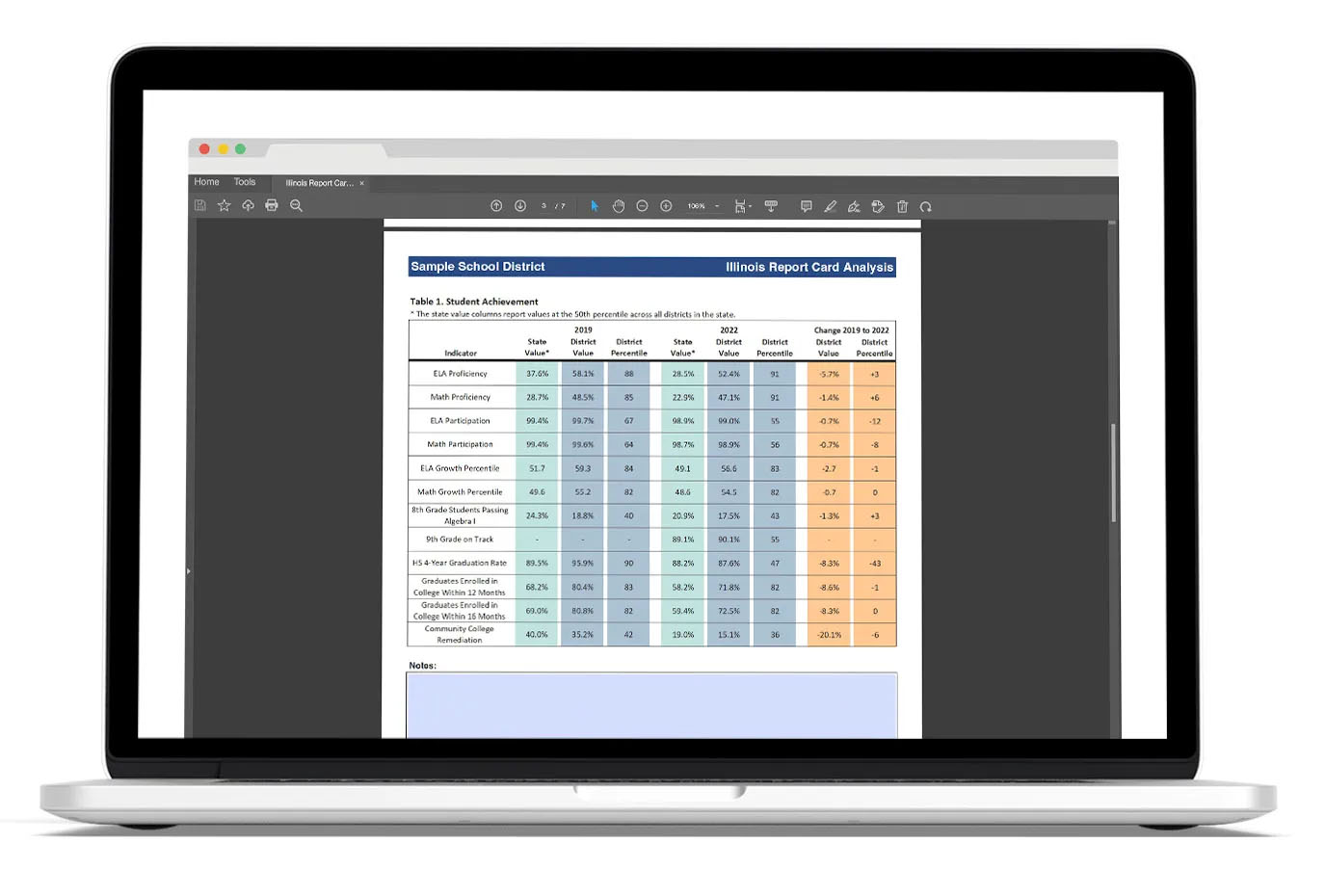 Each report, custom created for your district, will be delivered to you as a PDF file. The PDF has editable sections so that you may customize and save with the explanations your board and community needs.