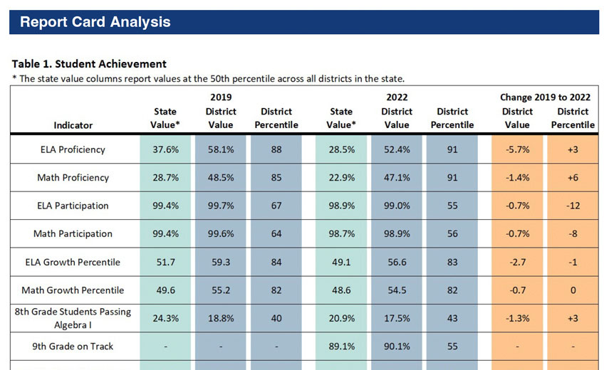 Simply reporting percentages from state data does not give the full picture of student achievement. Metrics reported from the state need to be put in context so that the board and community have a more complete picture of how the district is performing. ECRA’s Data Briefs convert raw report card metrics to percentiles that are easier to communicate, easier to understand, more accurate, and more contextualized.