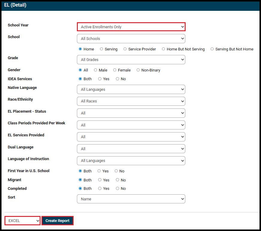 – School Year will default to Active Enrollments Only (the current school year). Select a different school year from the dropdown if desired.