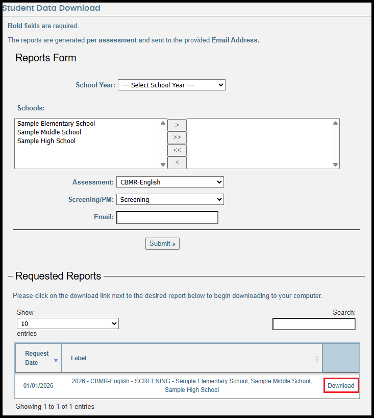 – Below the Reports Form, your most recently requested file will be at the top of the Requested Reports list.