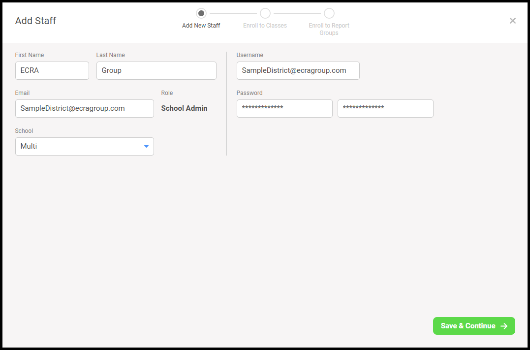 – Username & Email: combine your district name + @ecragroup.com (e.g., SampleDistrict@ecragroup.com).